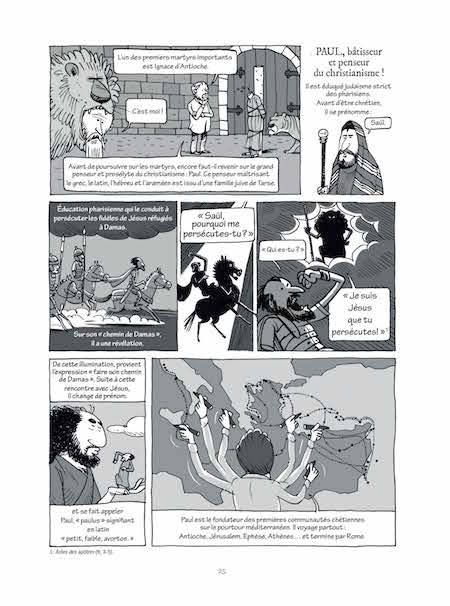 Les erreurs de traduction sont bien mises en évidence, ainsi la Bible juive parle d'Êve à côté d'Adam là où la version latine de ce texte évoque une Êve sortie de la côte d'Adam (page 62). Là où le texte latin donne : « Va-t-en par les routes et les jardins et force les gens à entrer afin que ma maison soit remplie », la version grecque dit : « Va-t-en par les routes et les jardins et engage les gens à entrer » (page 64). Cette vision romaine a permis de mettre très vite une lutte violente contre les hérésies. Les gags visuels sont très nombreux et portent bien en décalé le message d'une partie du discours chrétien de chacune des diverses époques de cette longue période.